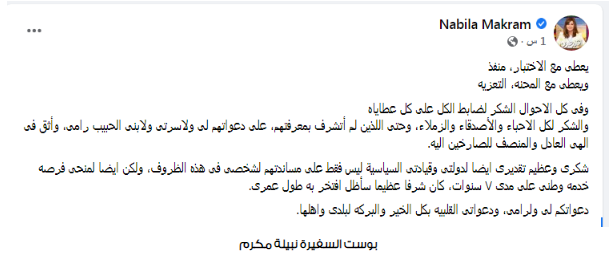 وأردفت قائلة: شكري وعظيم تقديري أيضا لدولتى وقيادتي السياسية، ليس فقط على مساندتهم لشخصي فى هذه الظروف، ولكن أيضا لمنحي فرصة خدمة وطني على مدى ٧ سنوات، كان شرفا عظيما سأظل أفتخر به طول عمرى.