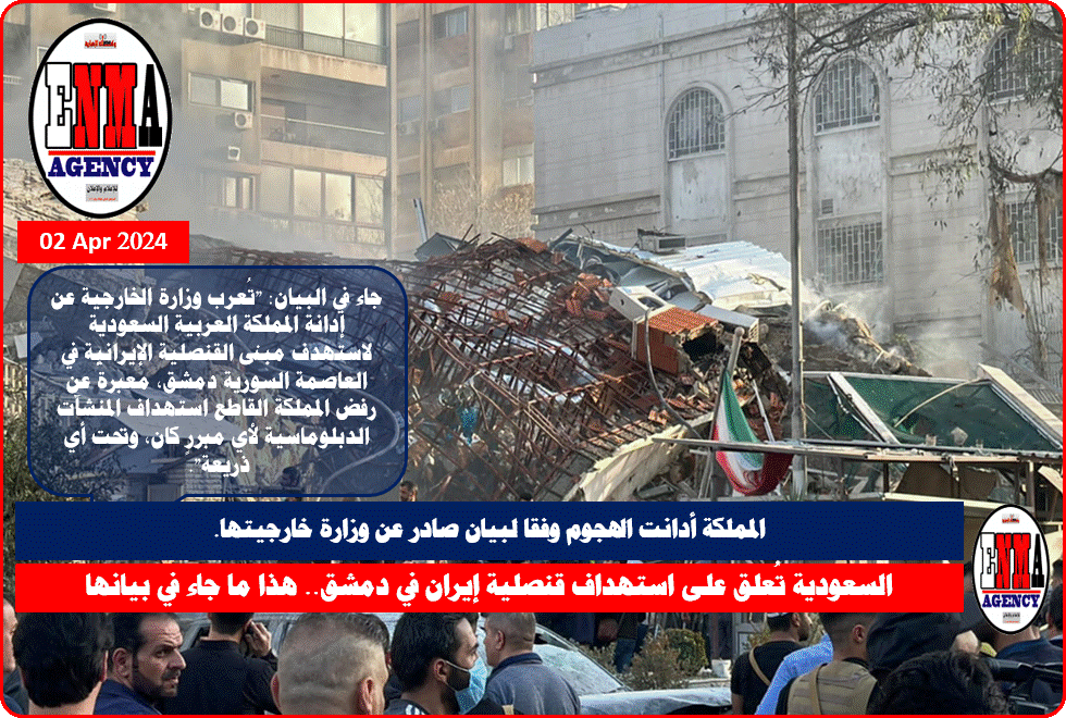 ورفضت الخارجية السعودية استهداف مقرات البعثات الدبلوماسية، إذ جاء في البيان: “تُعرب وزارة الخارجية عن إدانة المملكة العربية السعودية لاستهدف مبنى القنصلية الإيرانية في العاصمة السورية دمشق، معبرةً عن رفض المملكة القاطع استهداف المنشآت الدبلوماسية لأي مبررٍ كان، وتحت أي ذريعة”.